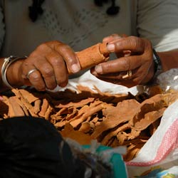6. Much of the ground cinnamon sold in North America is actually cassia, which is the variety of cinnamon grown in the Caribbean. Cassia has a stronger, more pungent flavor than true cinnamon. Once a year, the trees are harvested by carefully peeling the bark away from the branches. After the outer layer is removed, the inner bark is dried in the sun. As it dries, it begins to curl into sticks, and then is rolled and pressed by hand to complete the process.