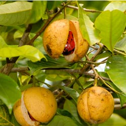 3. Nutmeg and mace come from the same tree. When its apricot-like fruit is ripe, it splits open to reveal a lacy, strawberry-red wrapper around the hard glossy brown shell that holds the nutmeg itself. This waxy red corset is mace, and more than 300 pounds of nutmegs are needed to yield a single pound of it.